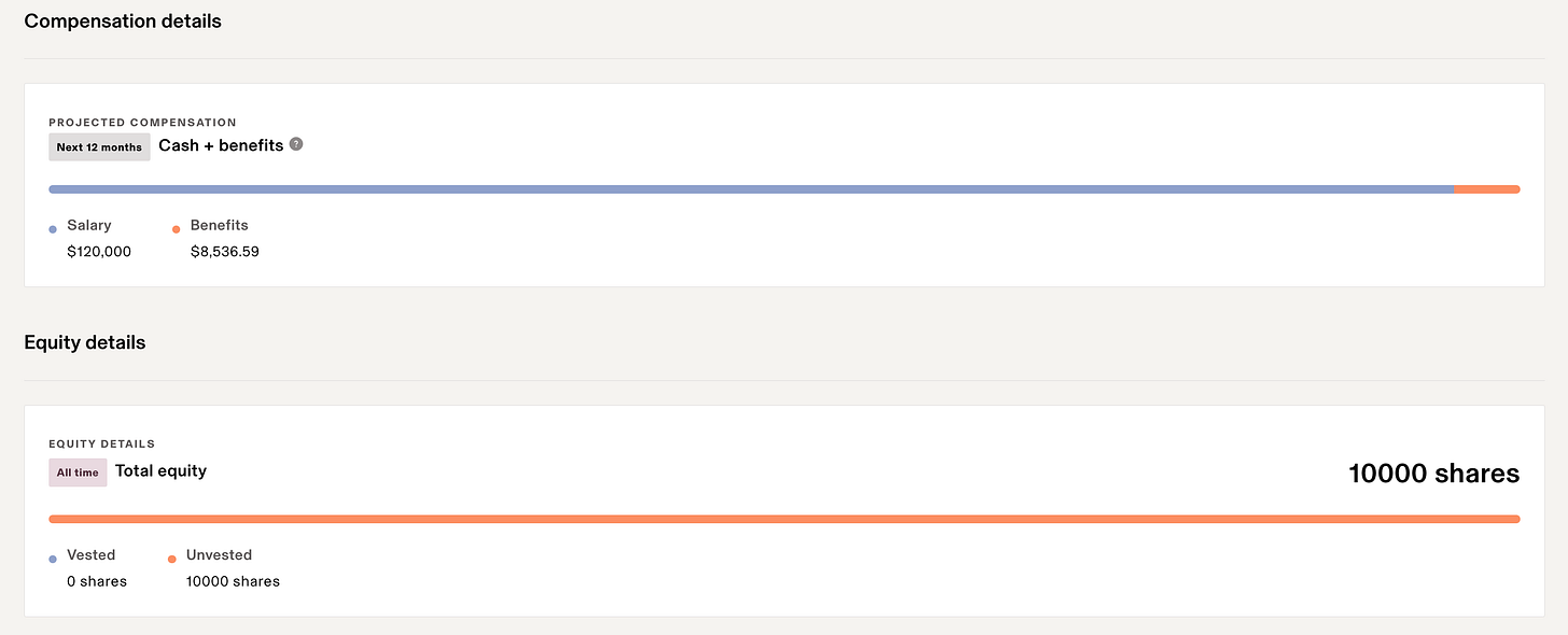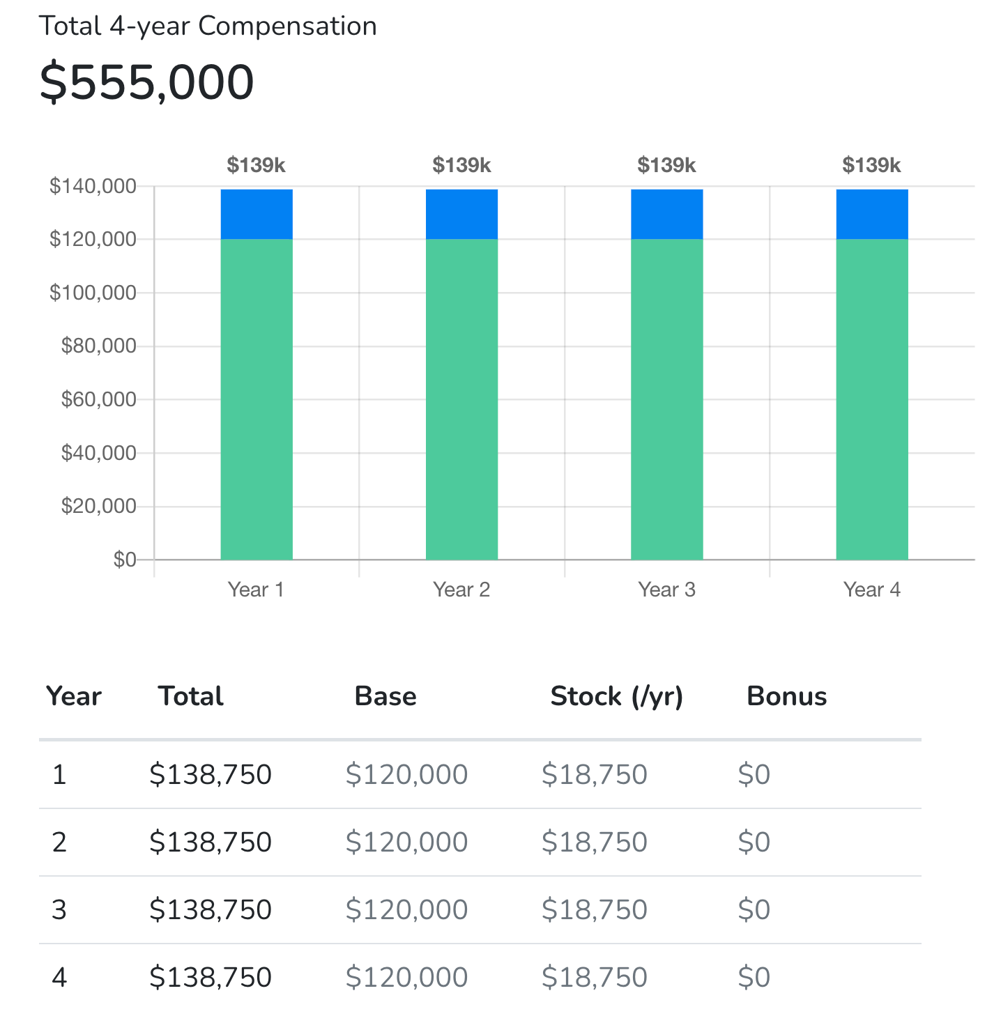 So my initial offer was $120k in cash + 10,000 ISOs in the company + benefits (note: in the United States, benefits typically cost your employer around ~16% of your salary, what is showing up here is my healthcare premium payments they offered, not the total cost to the company which would include things like payroll taxes)